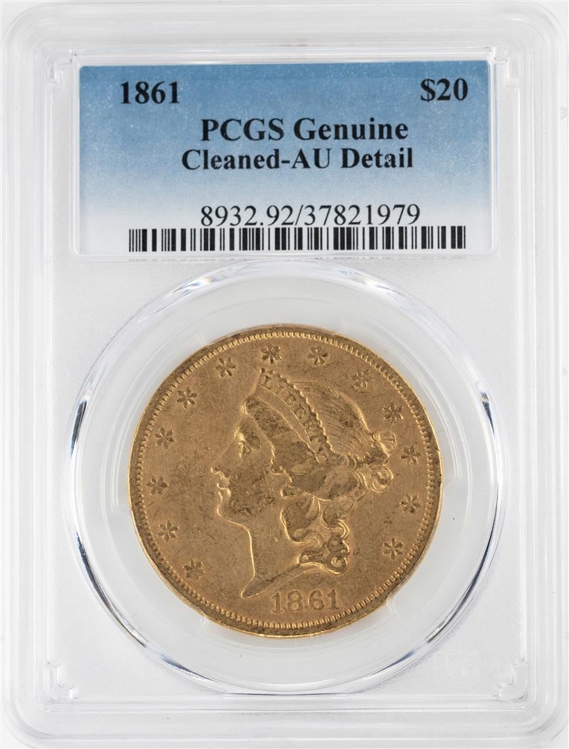 One 1861 $20 Liberty Head Double Eagle Gold Coin PCGS AU Details. PCGS Graded.