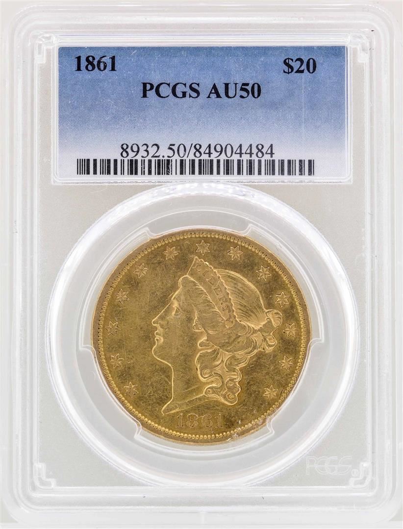 One 1861 $20 Liberty Head Double Eagle Gold Coin PCGS AU50. PCGS Graded.