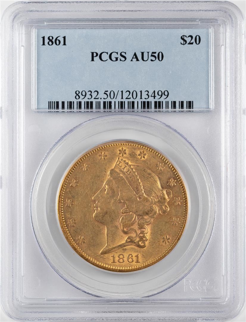 One 1861 $20 Liberty Head Double Eagle Gold Coin PCGS AU50. PCGS Graded.