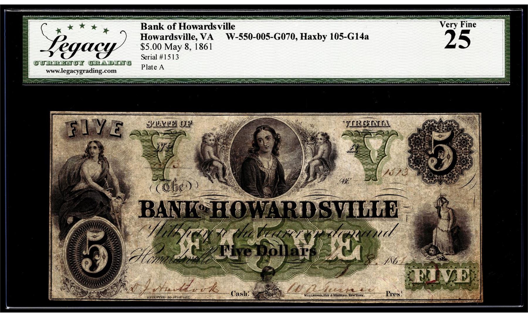 One 1861 $5 Bank of Howardsville, VA Obsolete Note Haxby 105-G14a Legacy Very Fine 25. Legacy Graded.