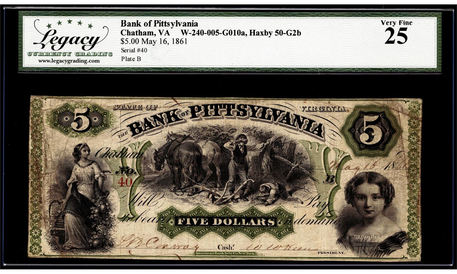 One 1861 $5 Bank of Pittsylvania Chatham, VA Obsolete Note Legacy Very Fine 25. Legacy Graded.
