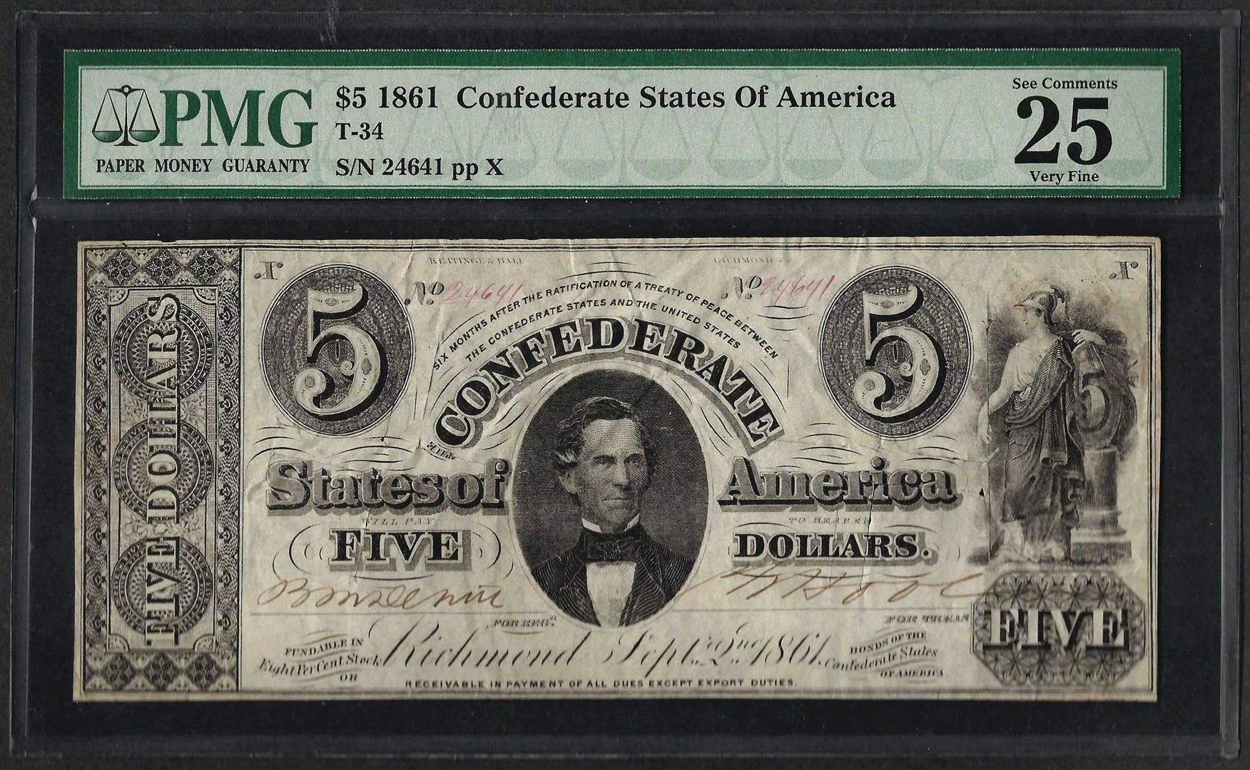 One 1861 $5 Confederate States of America Note T-34 PMG Very Fine 25 Canceled. PMG Certified.