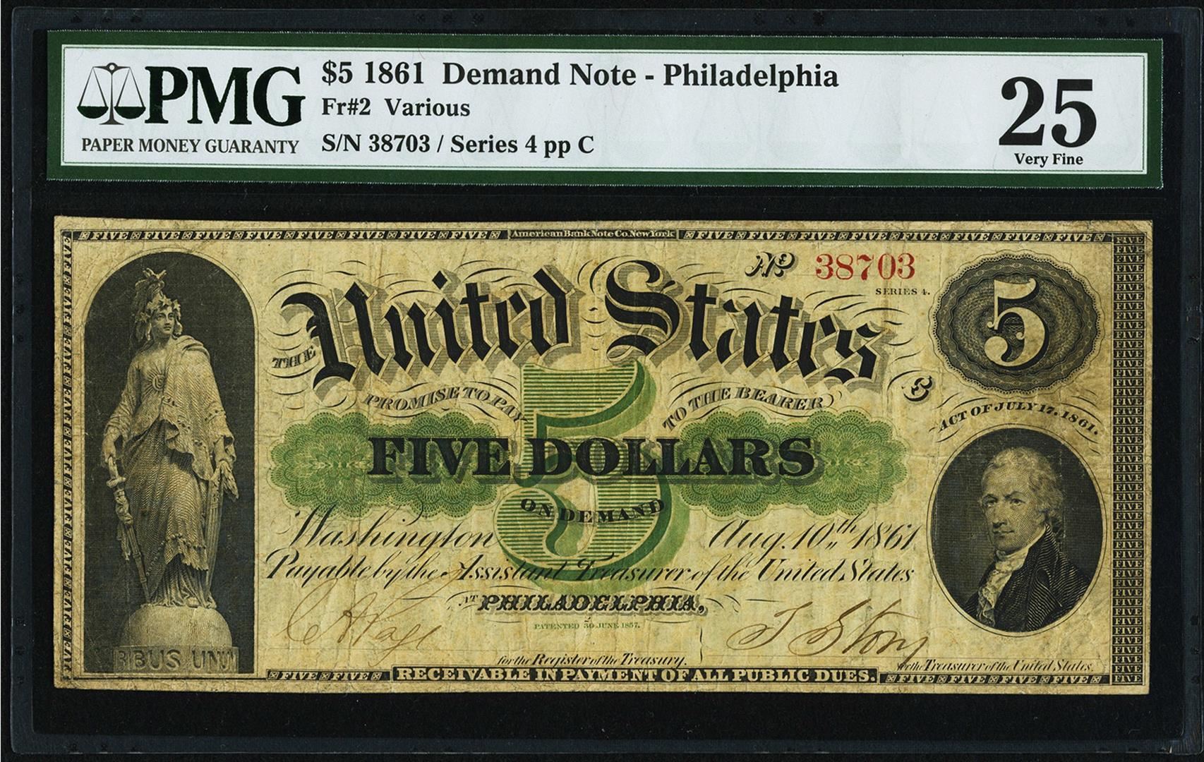 One 1861 $5 Demand Note Philadelphia Fr.2 PMG Very Fine 25. PMG Certified.