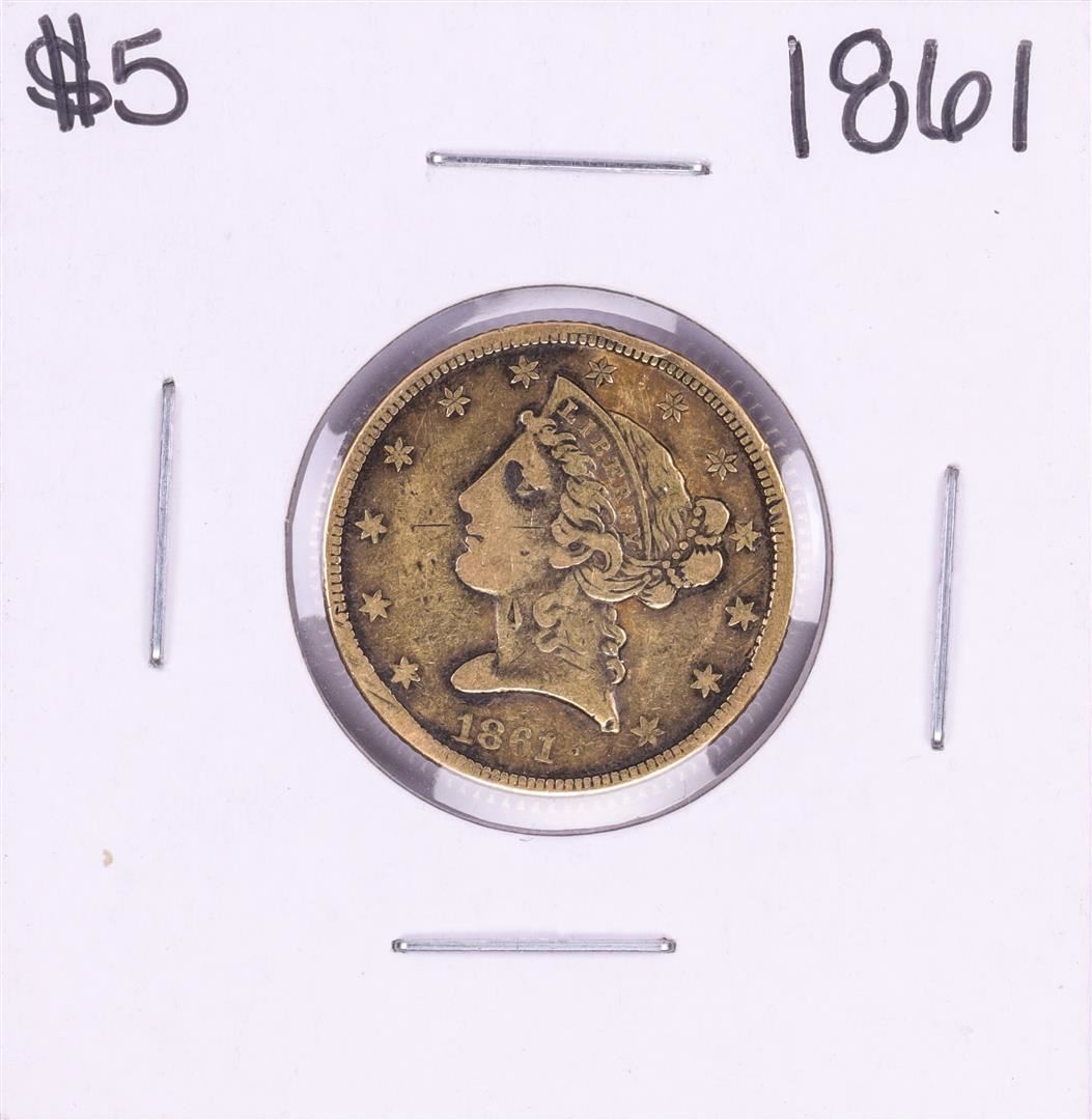 One 1861 $5 Liberty Head Half Eagle Gold Coin.
