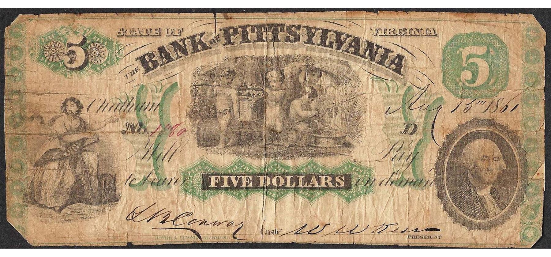 One 1861 $5 The Bank of Pittsylvania Obsolete Note.