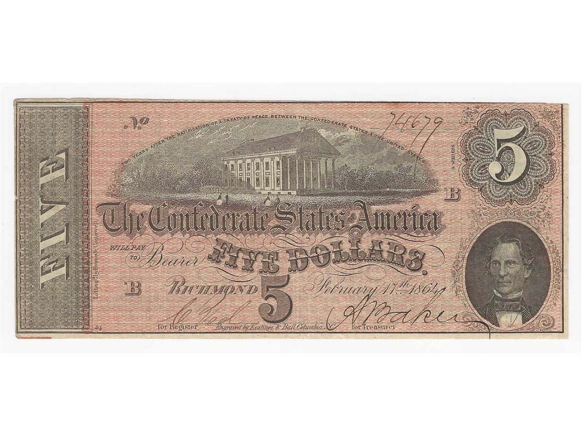 One 1861 $5 The Confederate States of America Note.