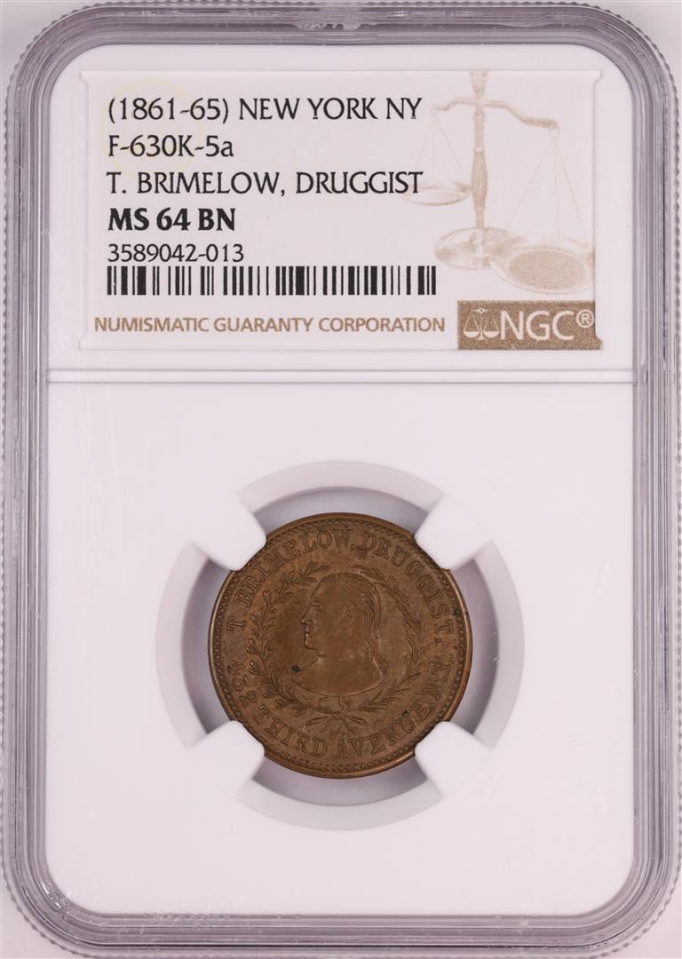 (1861-65) New York NY T. Brimelow Druggist Civil War Token NGC MS64BN