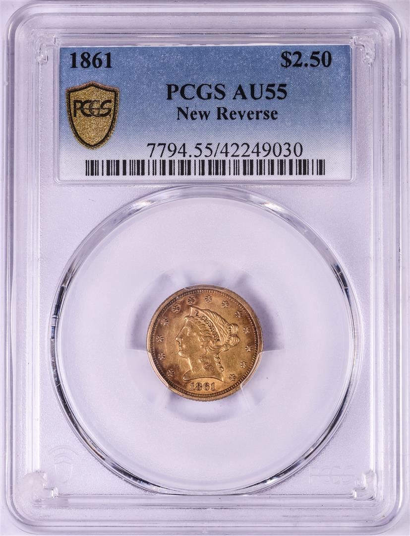 One 1861 New Reverse $2 1/2 Liberty Head Quarter Eagle Gold Coin PCGS AU55. PCGS Graded.