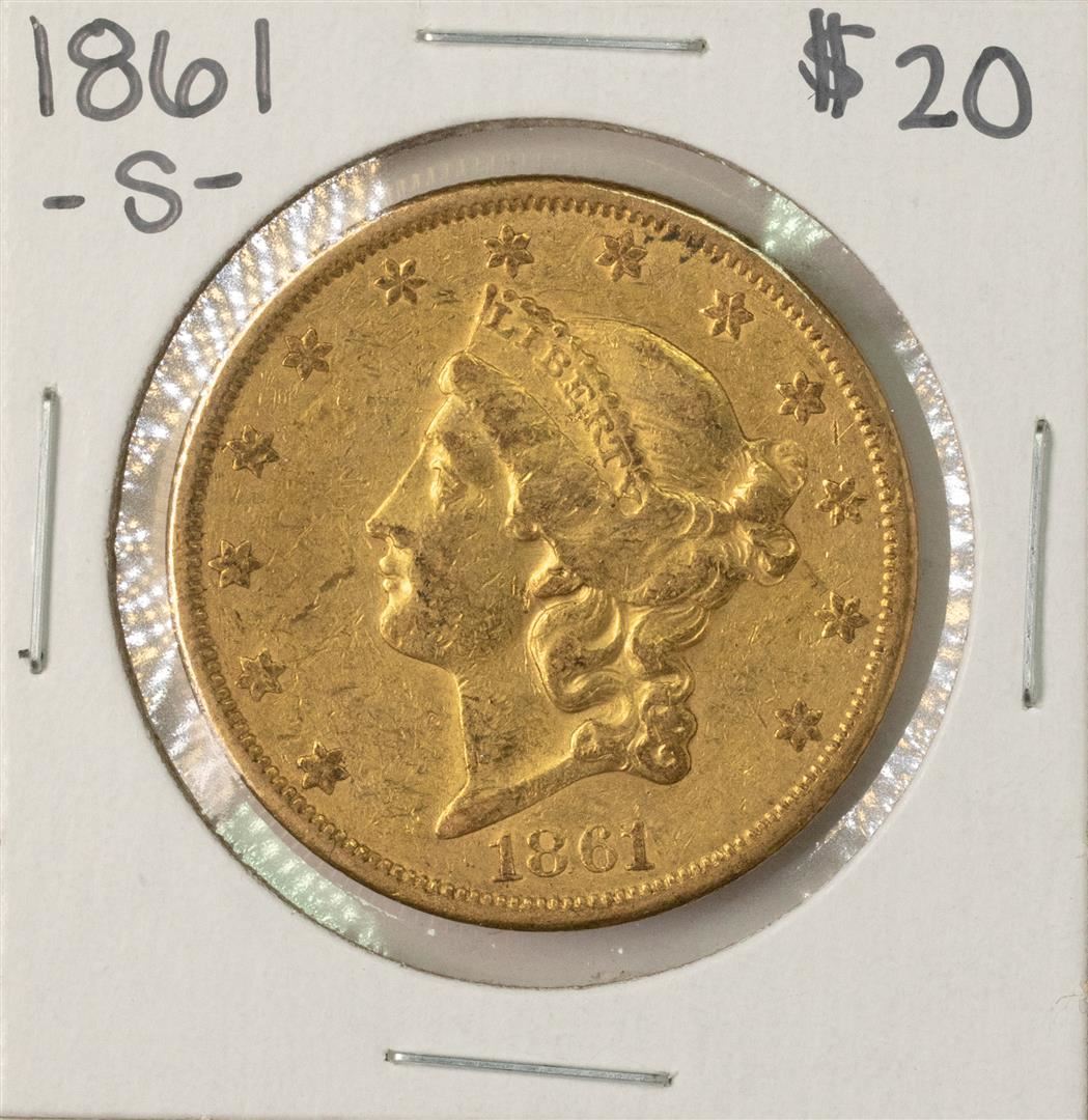 One 1861-S $20 Liberty Head Double Eagle Gold Coin.