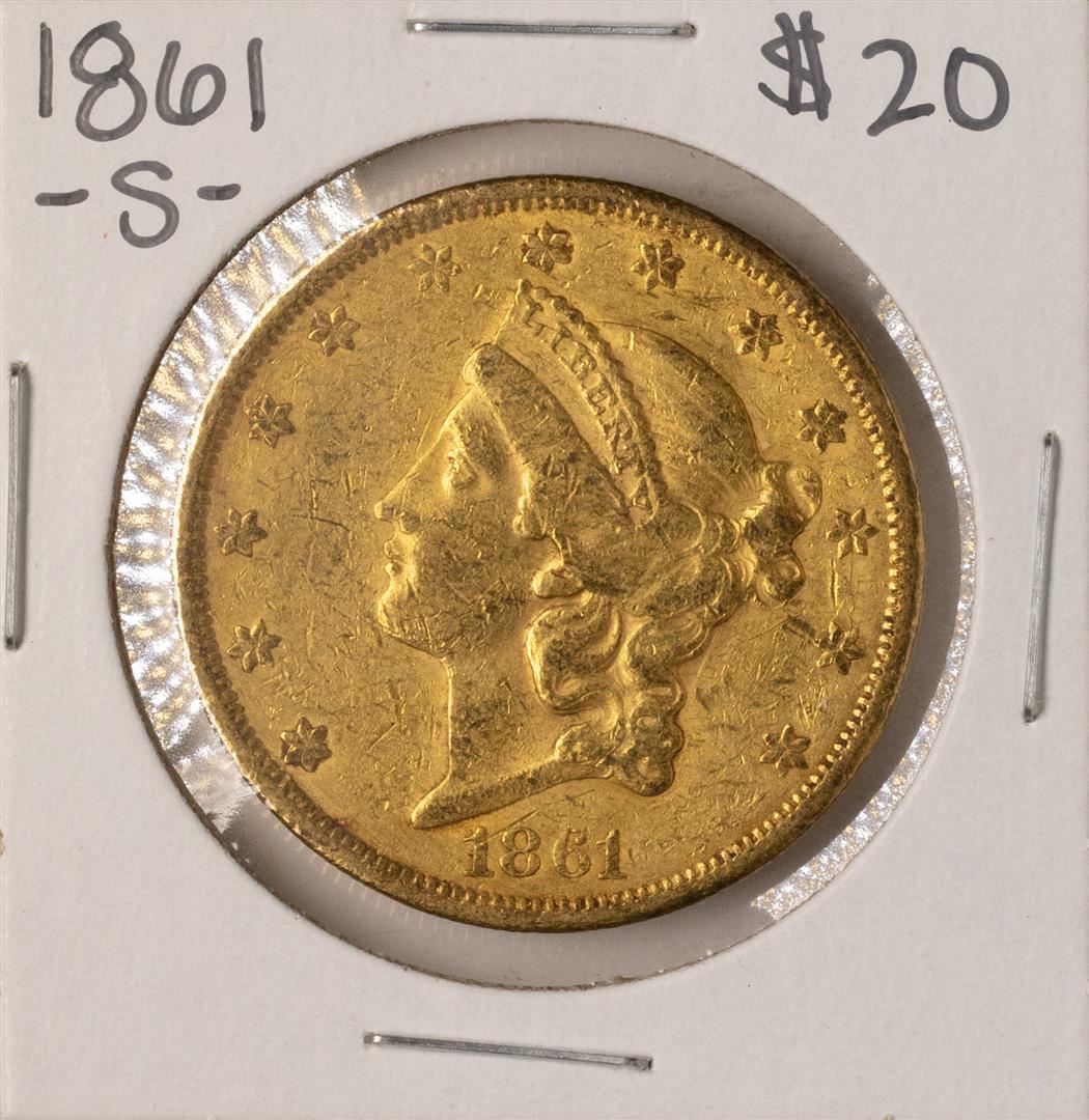 One 1861-S $20 Liberty Head Double Eagle Gold Coin.