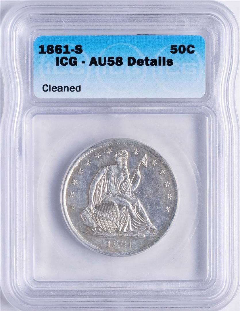 One 1861-S Seated Liberty Half Dollar Coin ICG AU58 Details. ICG Certified.