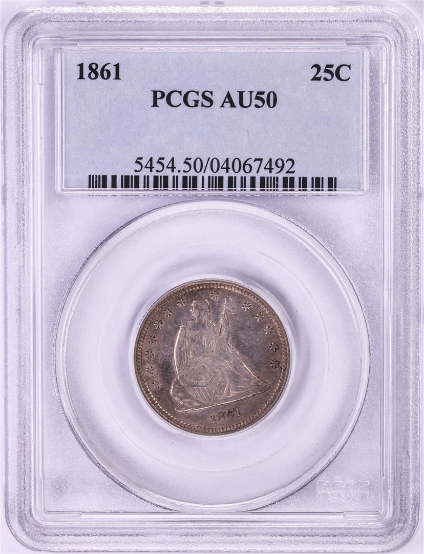 One 1861 Seated Liberty Quarter Coin PCGS AU50. PCGS Graded.