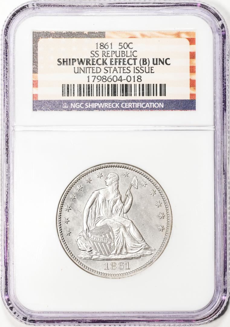One 1861 U.S. Issue SS Republic Seated Liberty Half Dollar Coin NGC Shipwreck Effect UNC. NGC Certified.