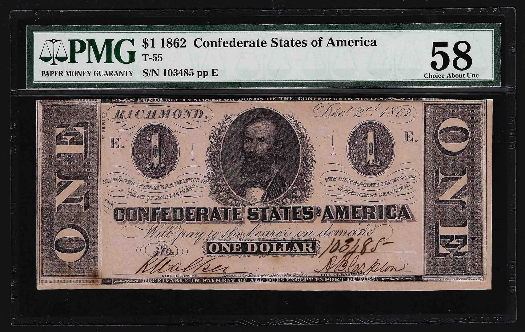One 1862 $1 Confederate States of America Note PMG Choice AU58. PMG Certified.