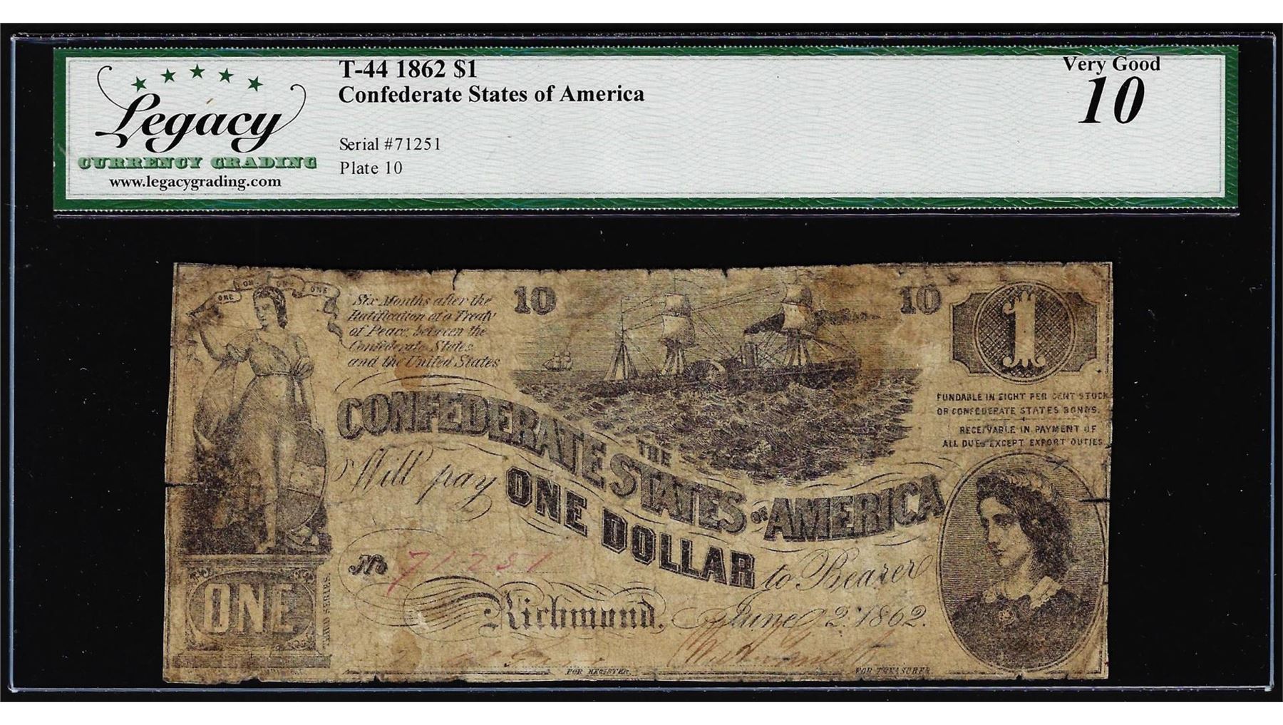 1862 $1 Confederate States of America Note T-44 Legacy Very Good 10