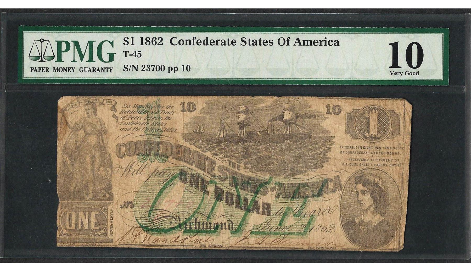 One 1862 $1 Confederate States of America Note T-45 PMG Very Good 10. PMG Certified.