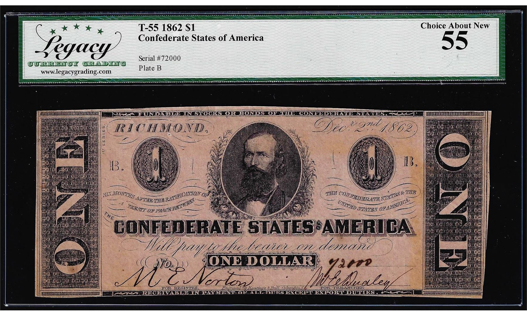 One 1862 $1 Confederate States of America Note T-55 Legacy Choice About New 55. Legacy Graded.