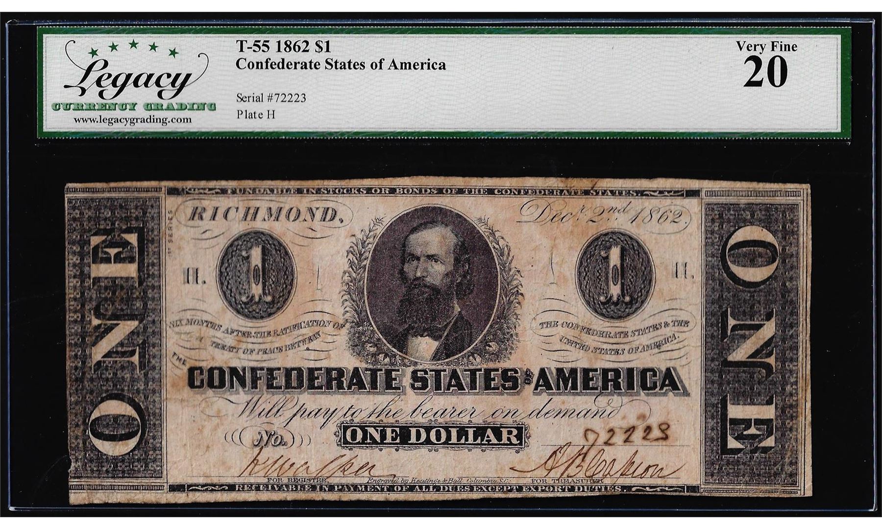 1862 $1 Confederate States of America Note T-55 Legacy Very Fine 20