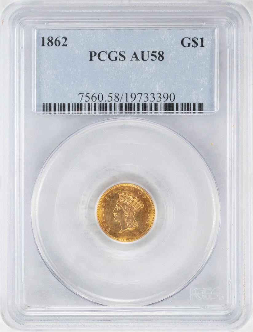 One 1862 $1 Indian Princess Head Gold Dollar Coin PCGS AU58. PCGS Graded.