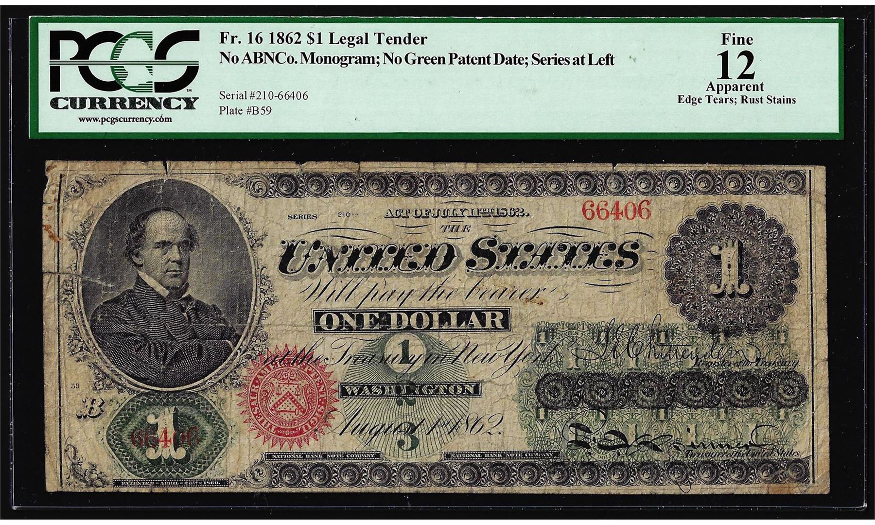 1862 $1 Legal Tender Note Fr.16 PCGS Fine 12 Apparent