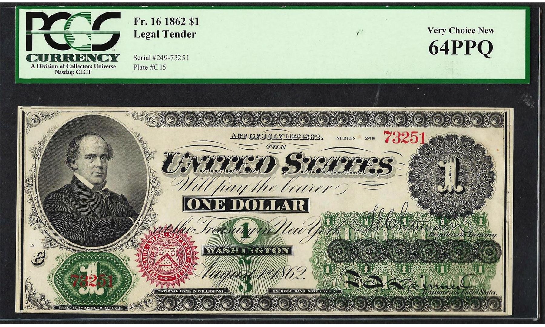 One 1862 $1 Legal Tender Note Fr.16 PCGS Very Choice New 64PPQ. PCGS Graded.