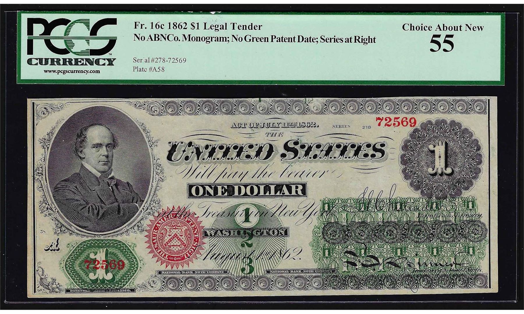 One 1862 $1 Legal Tender Note PCGS Choice About New 55. PCGS Graded.