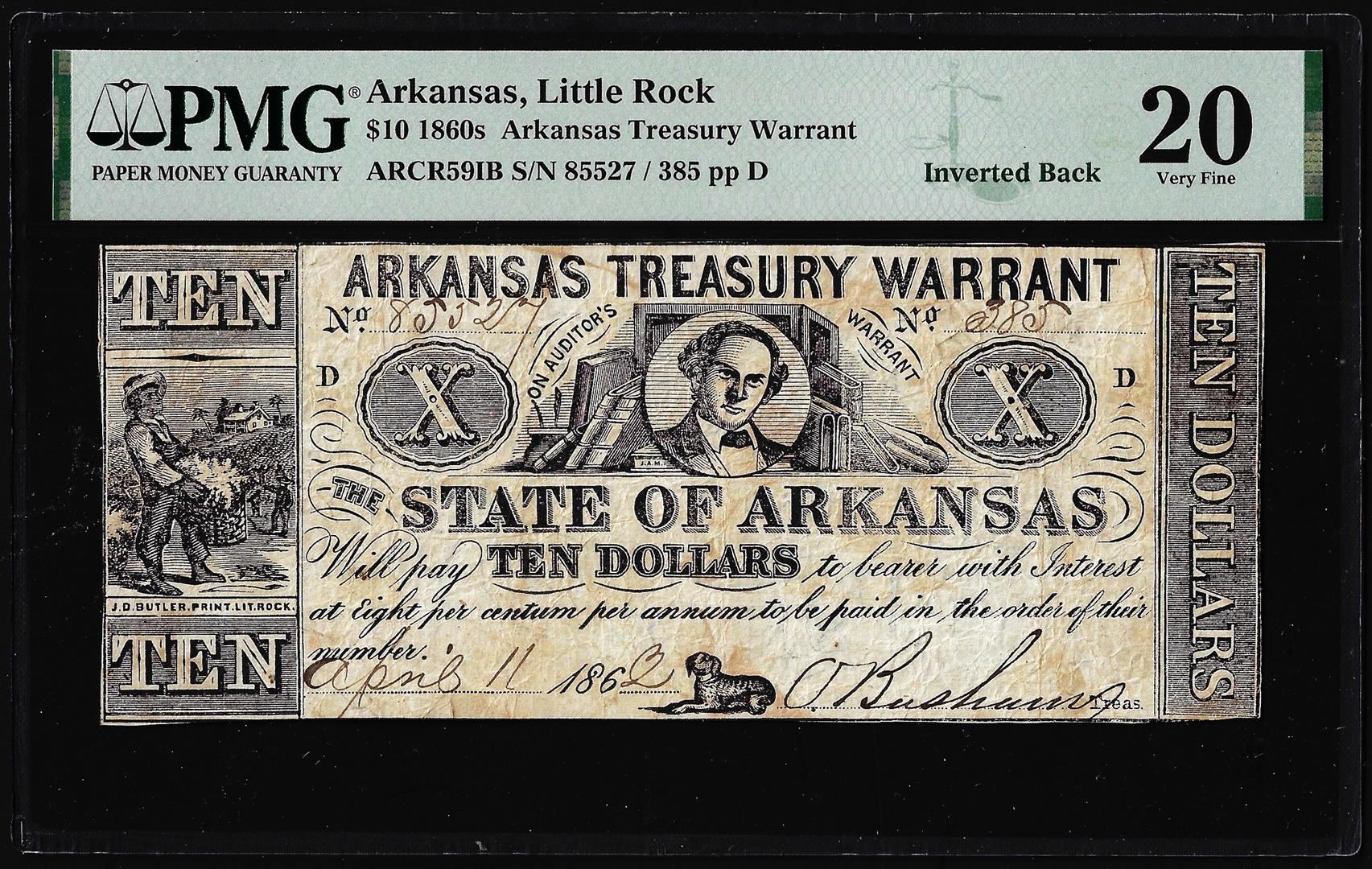 One 1862 $10 Arkansas Treasury Warrant Inverted Back Error Obsolete Note PMG Very Fine 20. PMG Certified.