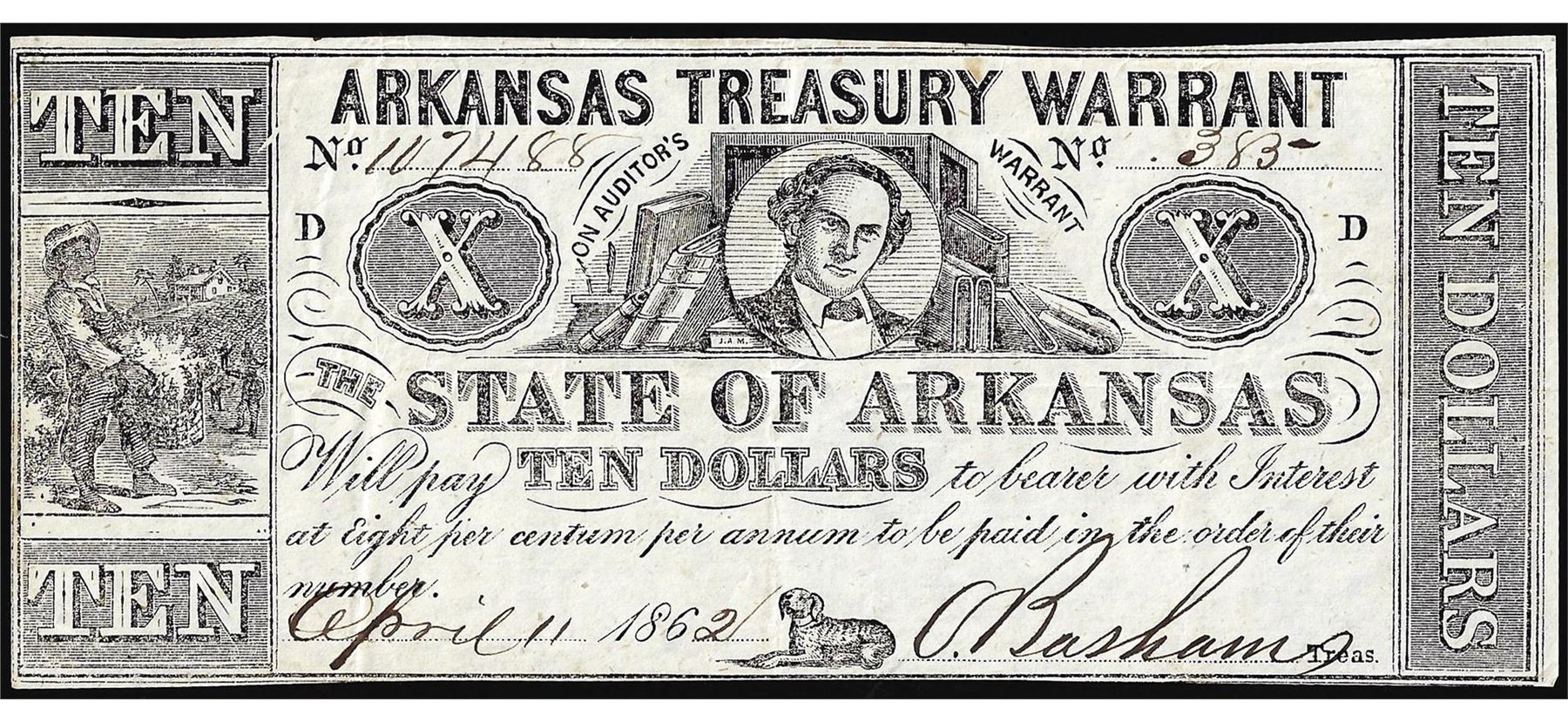 1862 $10 Arkansas Treasury Warrant Little Rock, AR Obsolete Note