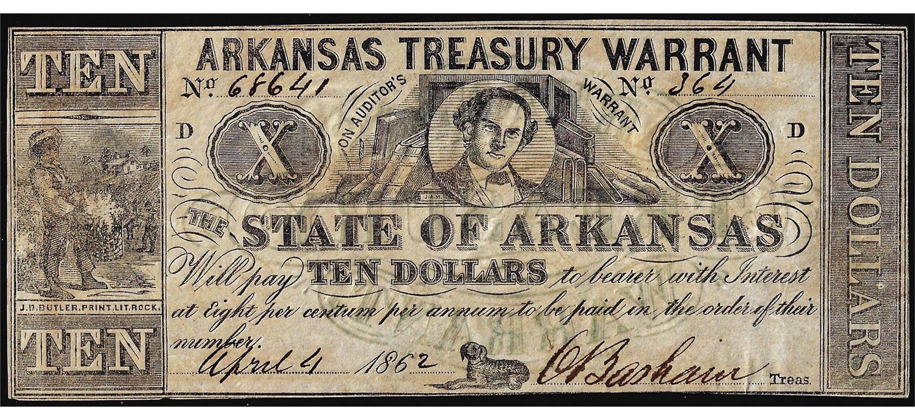 1862 $10 Arkansas Treasury Warrant Little Rock, AR Obsolete Note