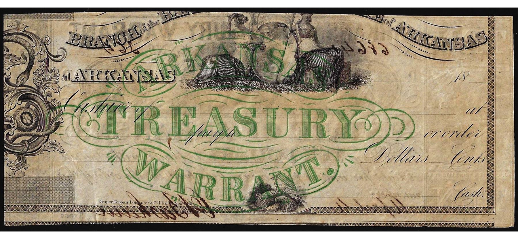 One 1862 $10 Arkansas Treasury Warrant Little Rock, AR Obsolete Note.