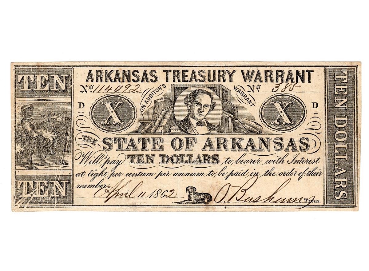One 1862 $10 Arkansas Treasury Warrant Obsolete Note.