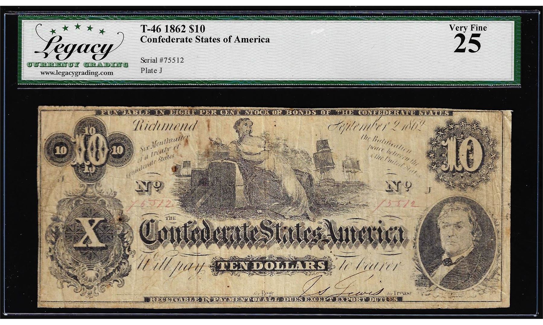 1862 $10 Confederate States of America Note T-46 Legacy Very Fine 25