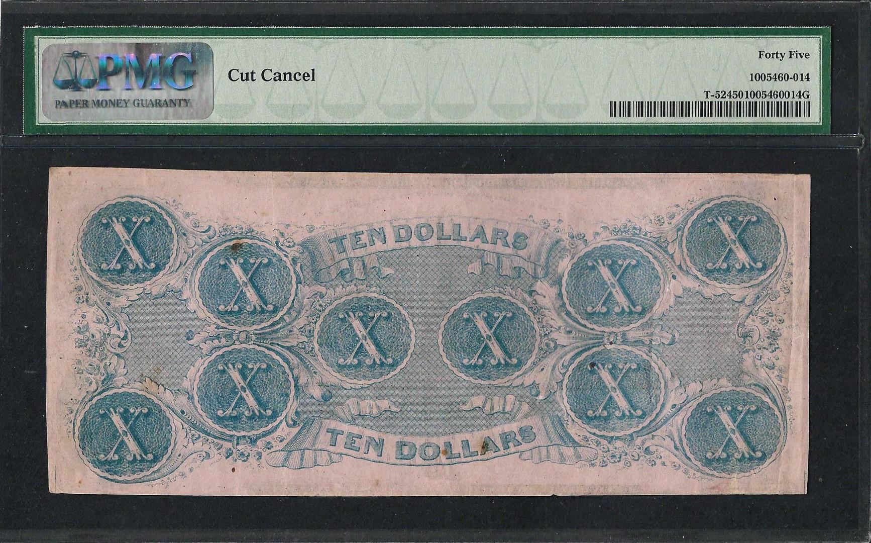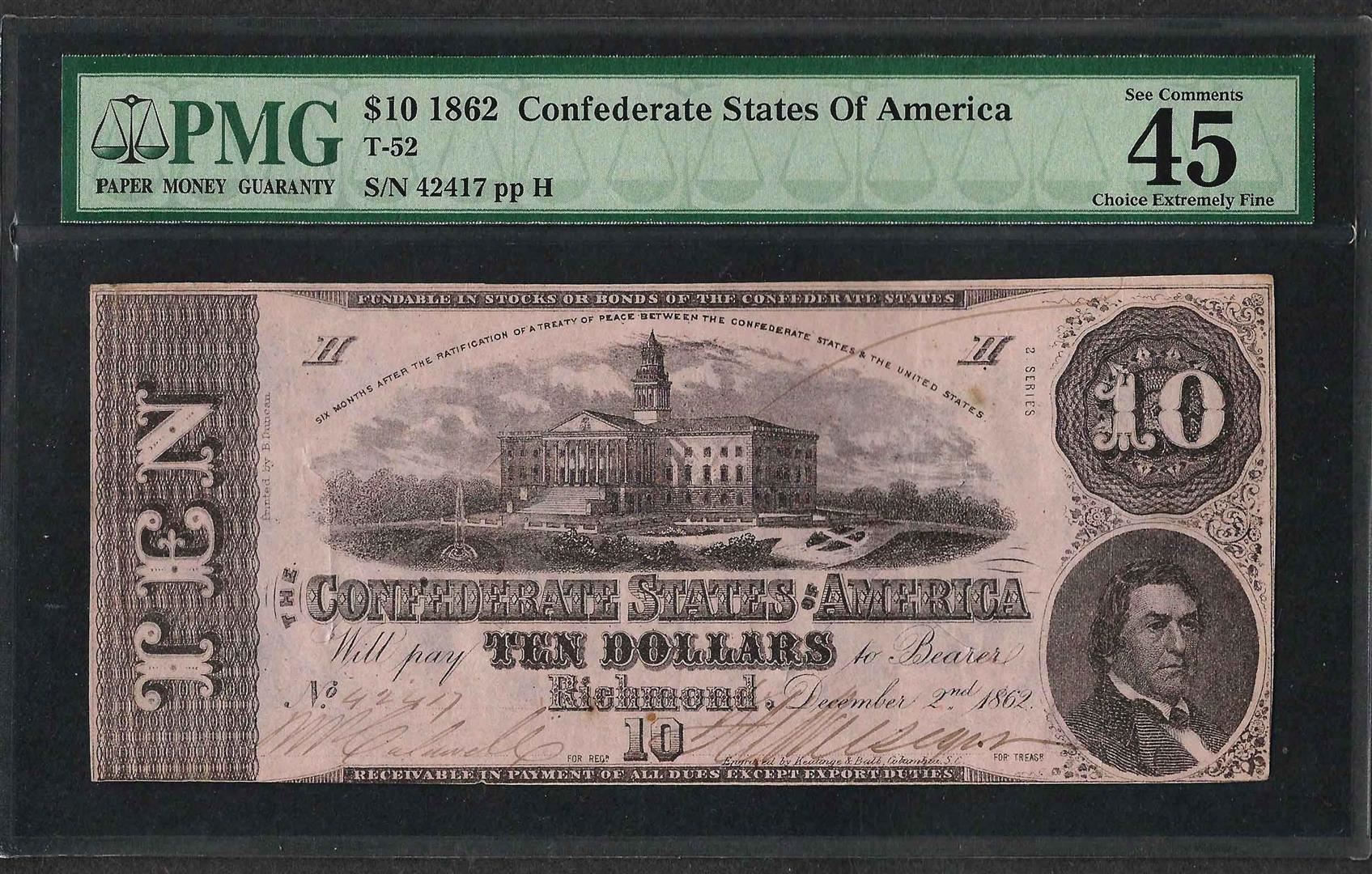 One 1862 $10 Confederate States of America Note T-52 PMG Extremely Fine 45. PMG Certified.