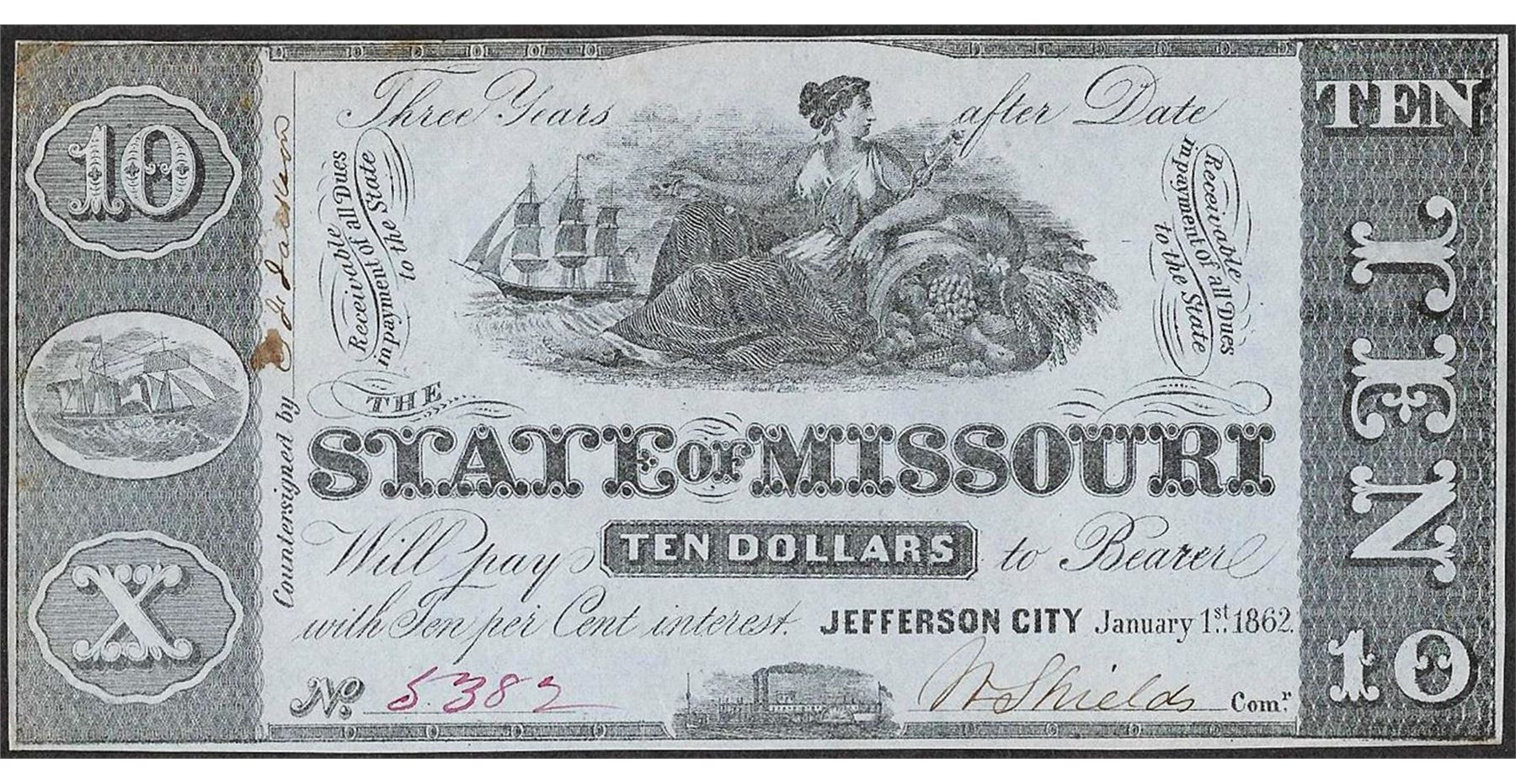 One 1862 $10 State of Missouri Obsolete Currency Note.