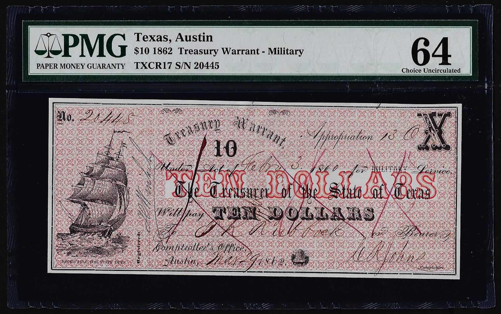 One 1862 $10 Treasury Warrant Austin, Texas Obsolete Note PMG Choice Uncirculated 64. PMG Certified.