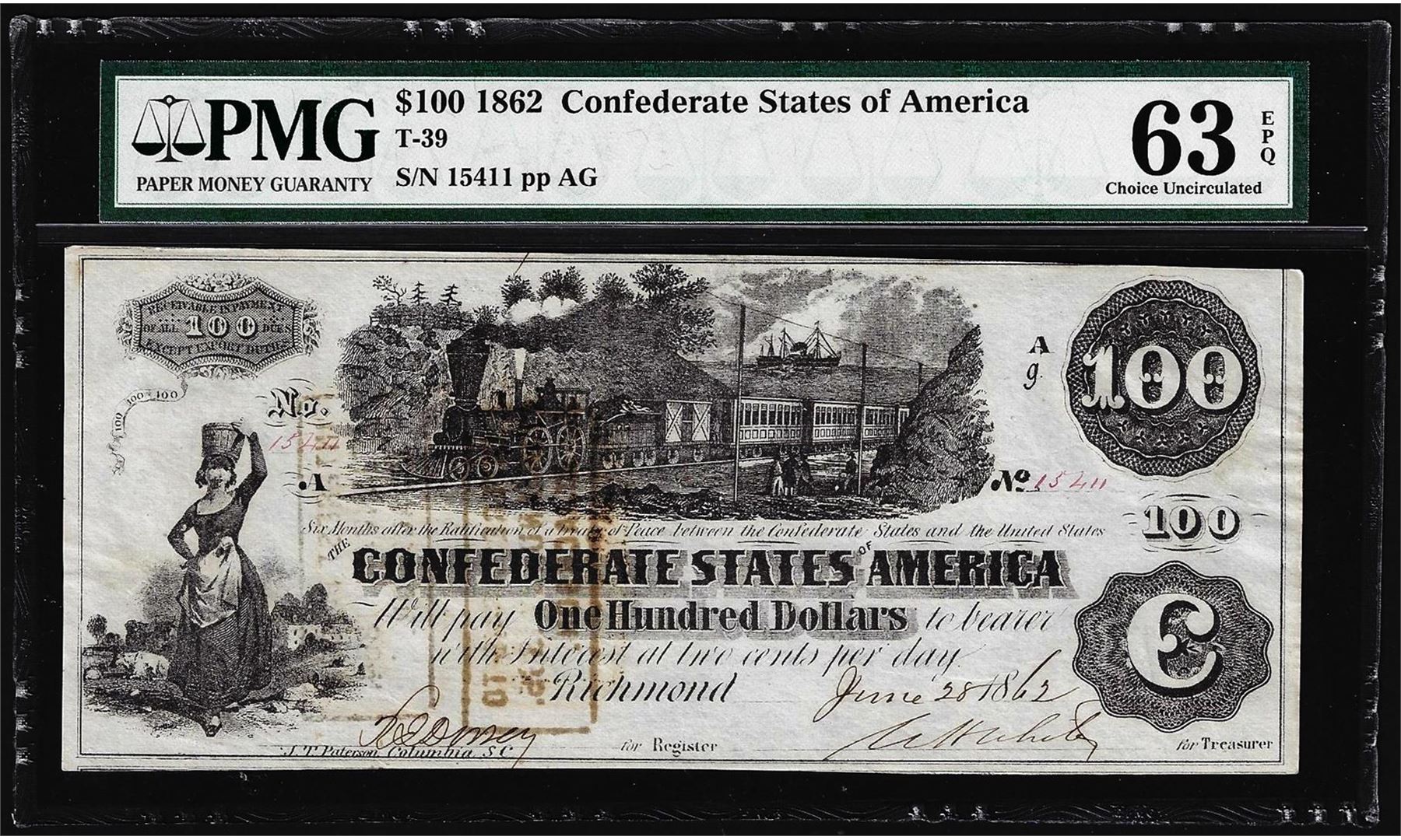 1862 $100 Confederate State of America Note T-39 PMG Choice Uncirculated 63EPQ