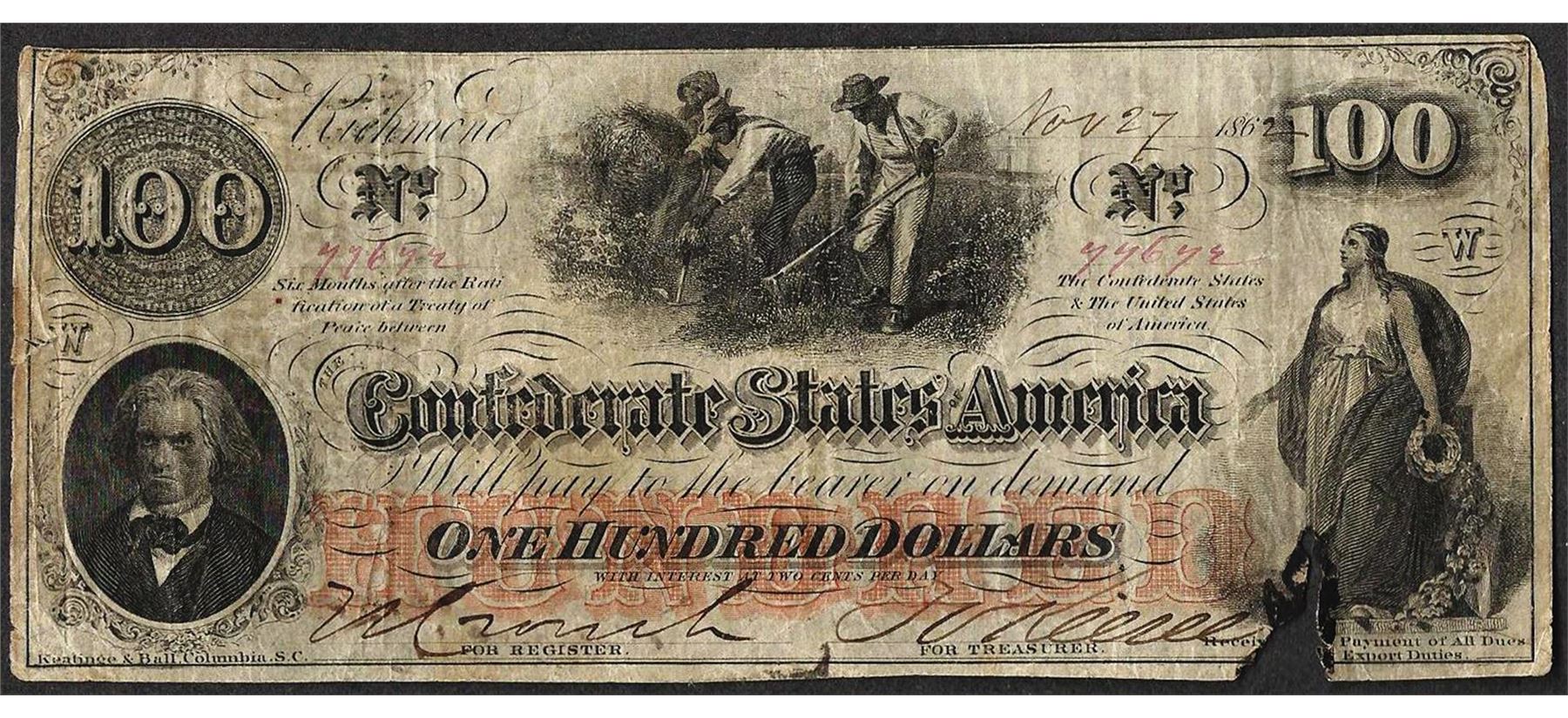 One 1862 $100 Confederate States of America Note - Missing Piece.