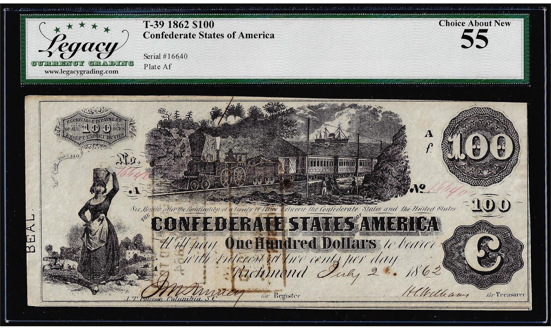 One 1862 $100 Confederate States of America Note T-39 Legacy Choice About New 55. Legacy Graded.