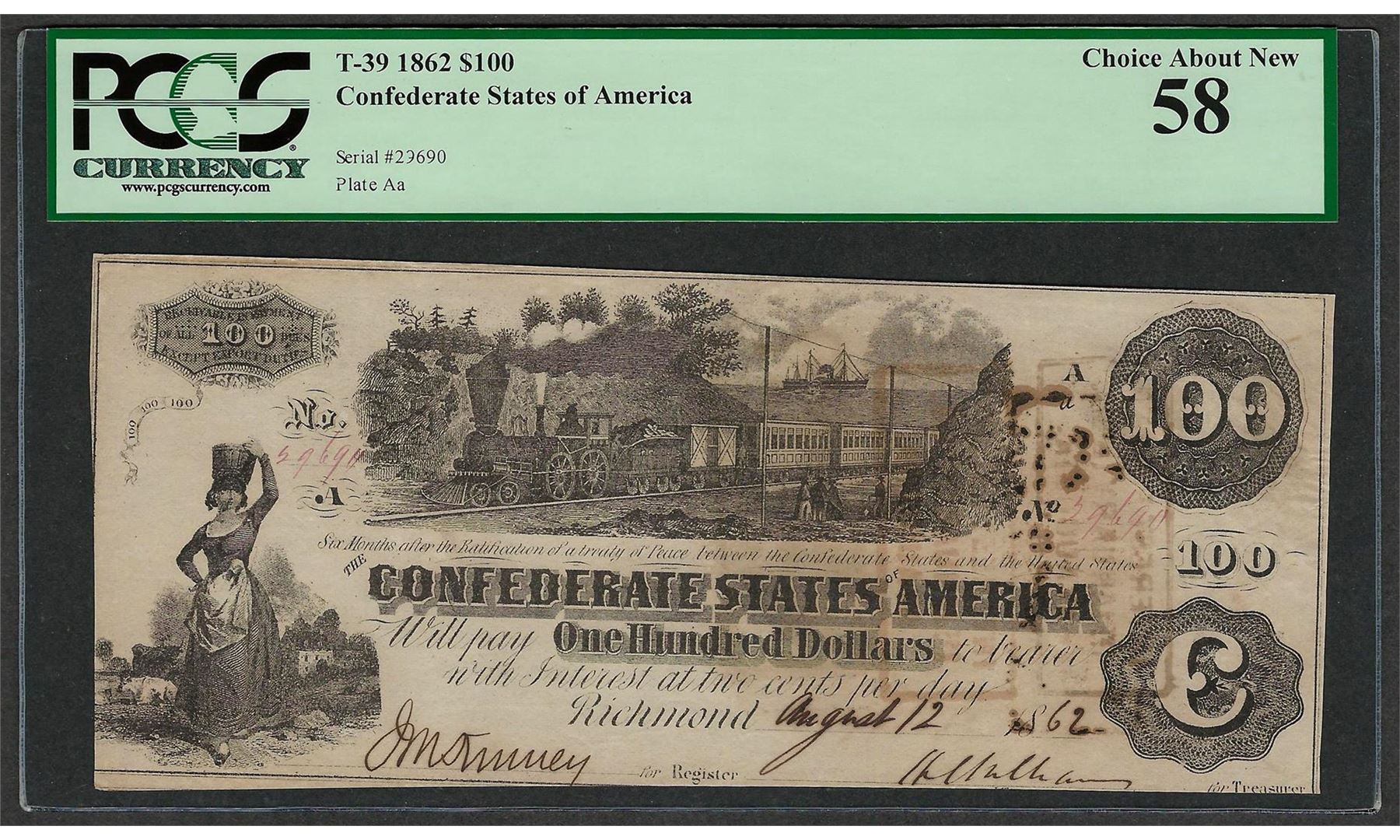 1862 $100 Confederate States of America Note T-39 PCGS About New 58