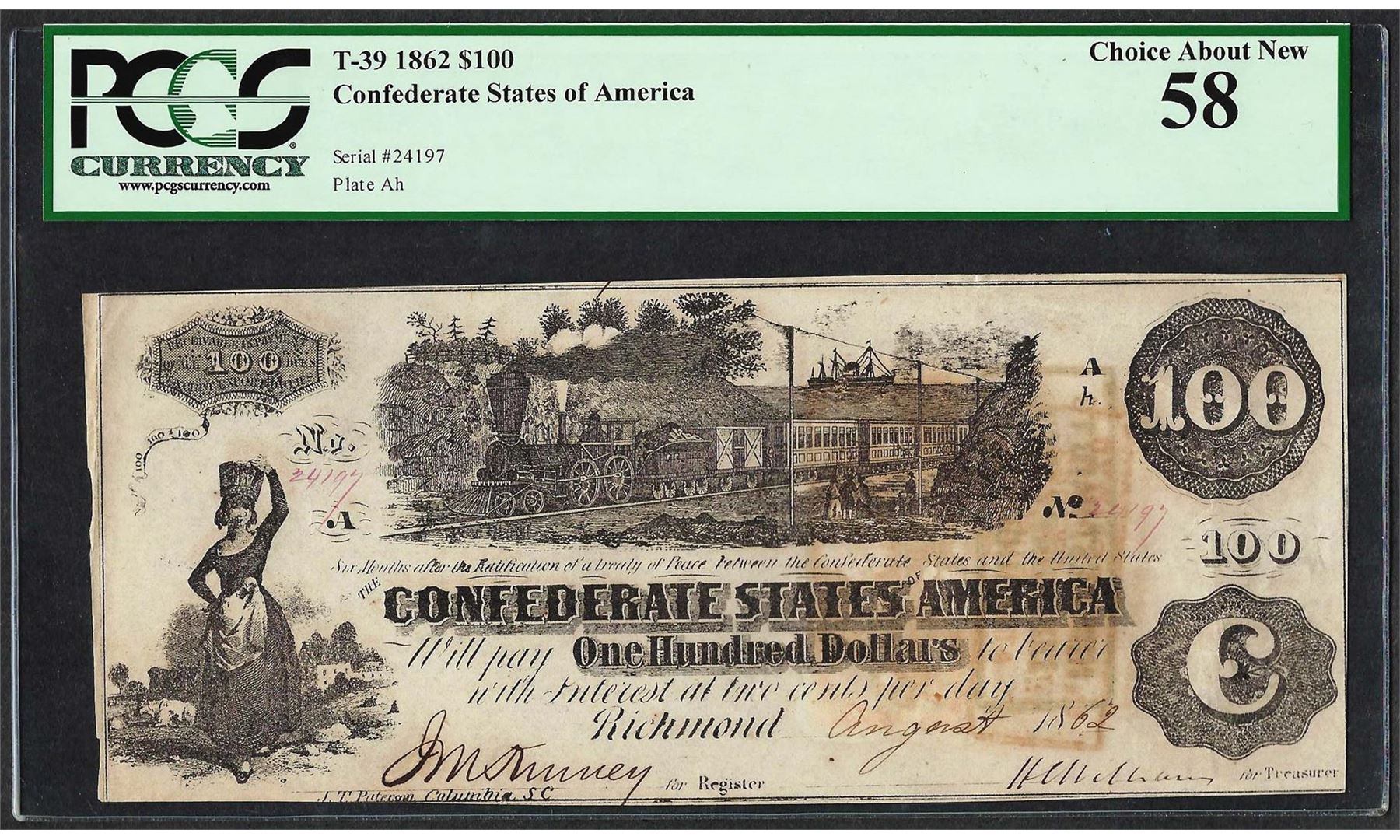 1862 $100 Confederate States of America Note T-39 PCGS Choice About New 58