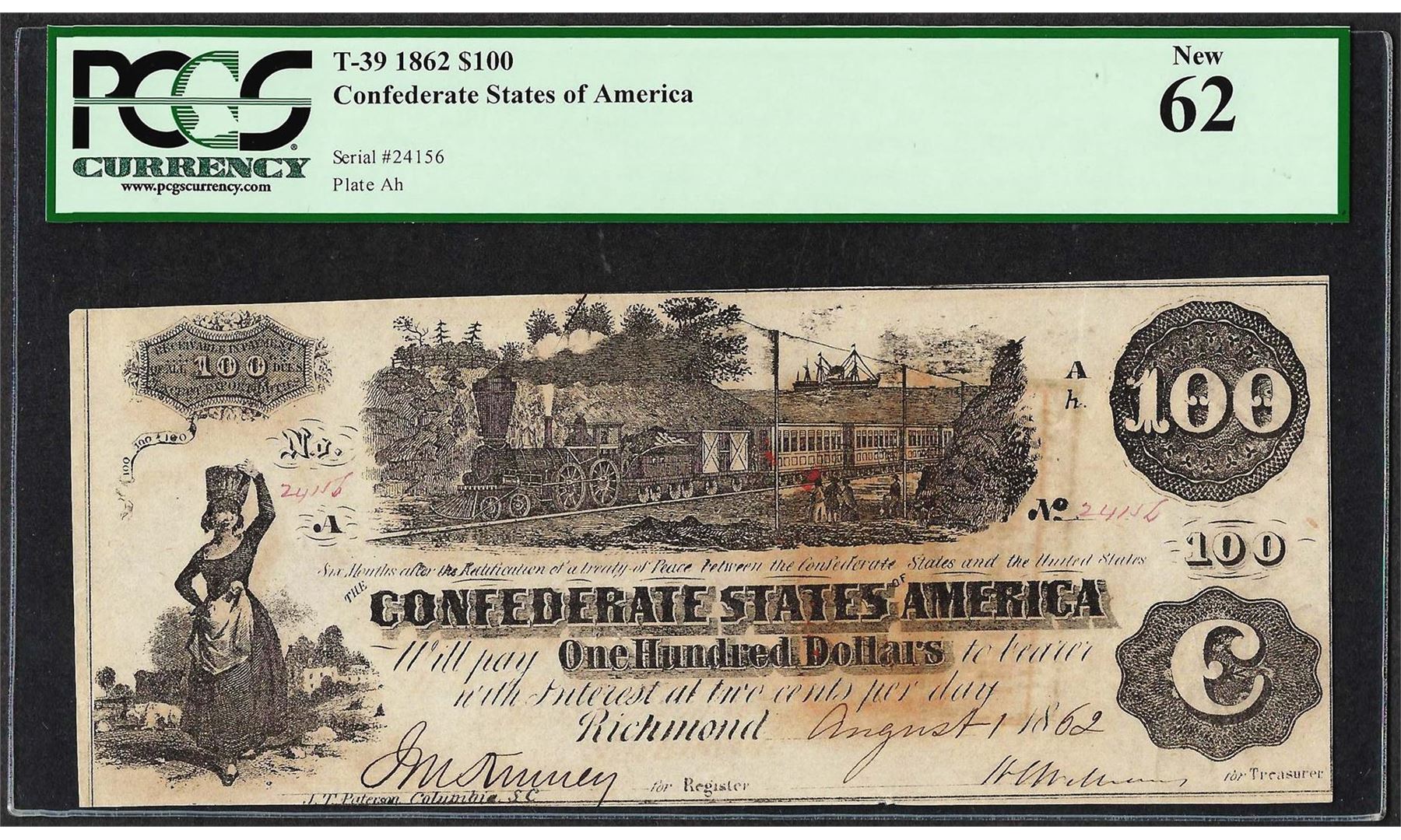 1862 $100 Confederate States of America Note T-39 PCGS New 62
