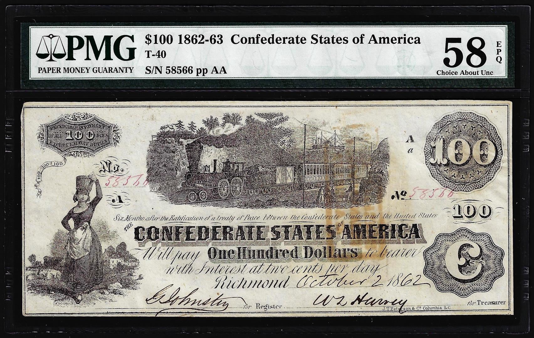 1862 $100 Confederate States of America Note T-40 PMG About Uncirculated 58EPQ