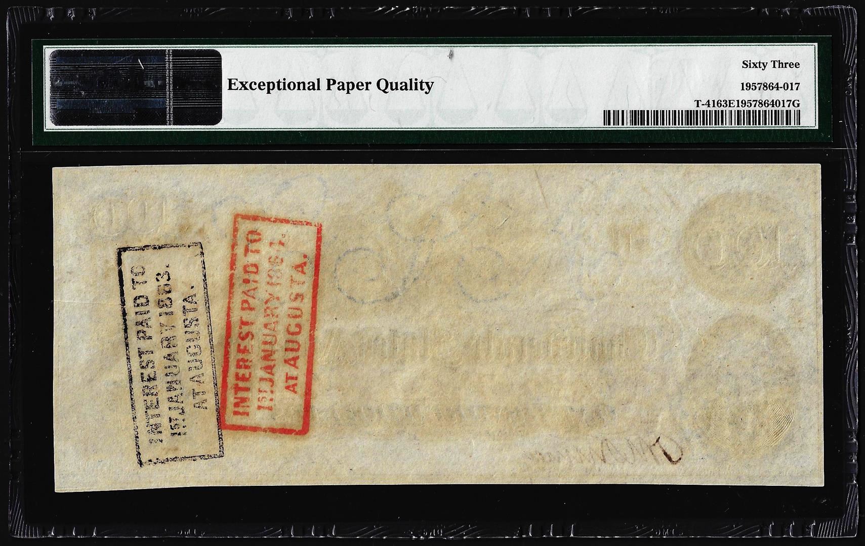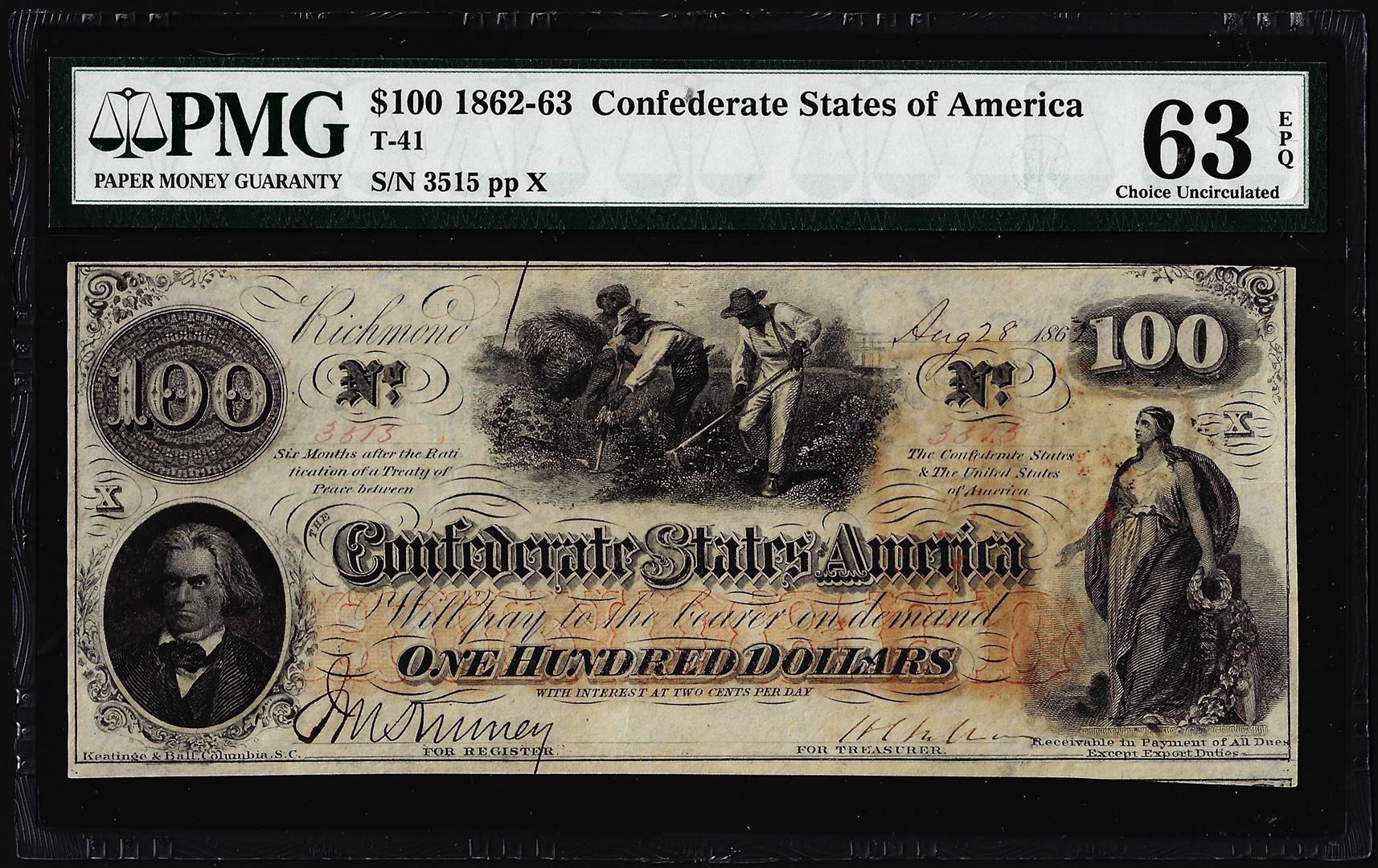 1862 $100 Confederate States of America Note T-41 PMG Choice Uncirculated 63EPQ