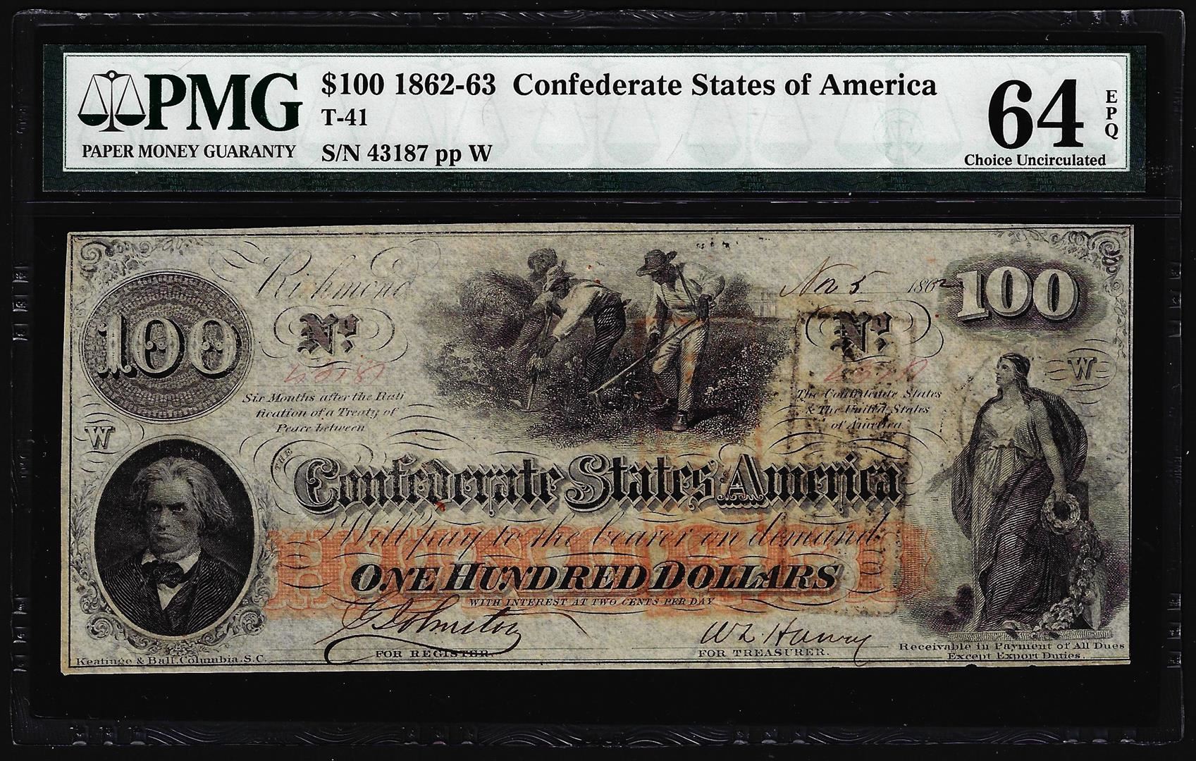 1862 $100 Confederate States of America Note T-41 PMG Choice Uncirculated 64EPQ