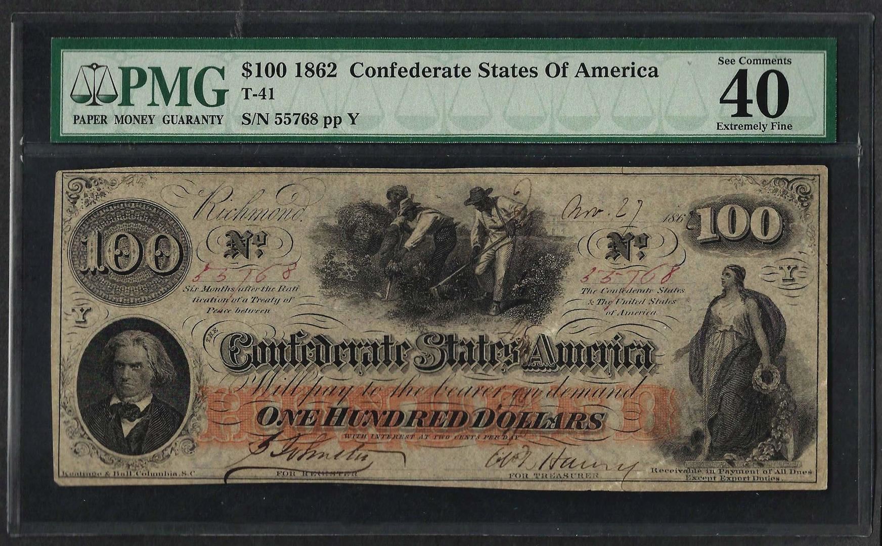 One 1862 $100 Confederate States of America Note T-41 PMG Extremely Fine 40EPQ. PMG Certified.