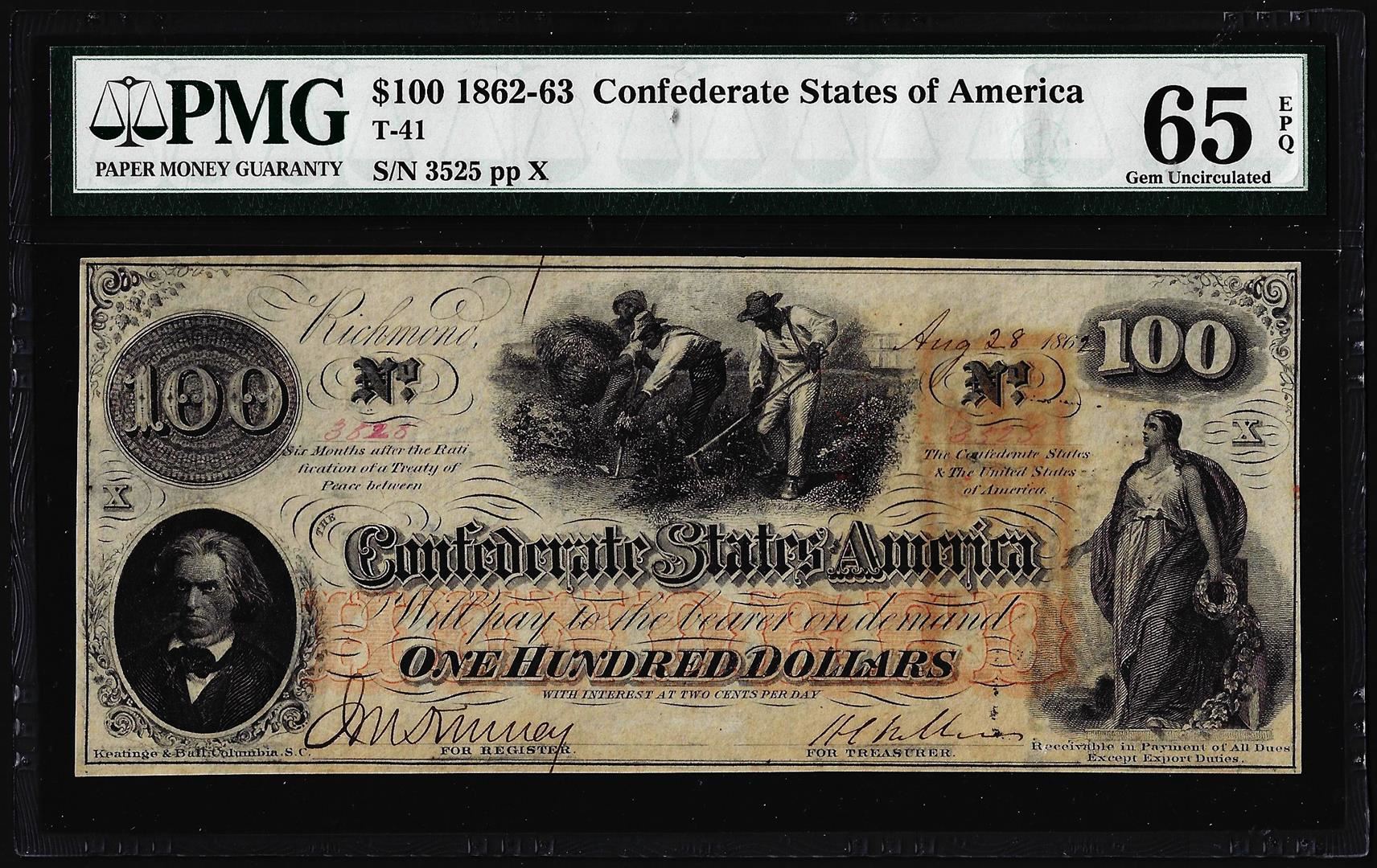 1862 $100 Confederate States of America Note T-41 PMG Gem Uncirculated 65EPQ