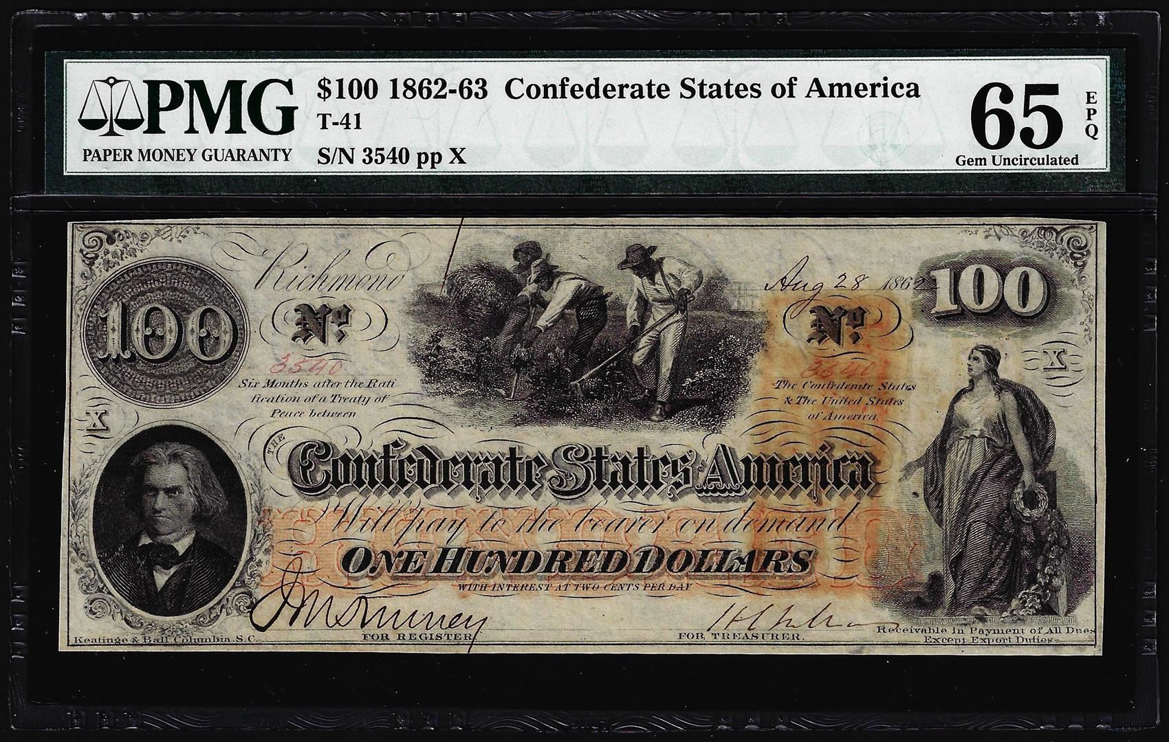 One 1862 $100 Confederate States of America Note T-41 PMG Gem Uncirculated 65EPQ. PMG Certified.