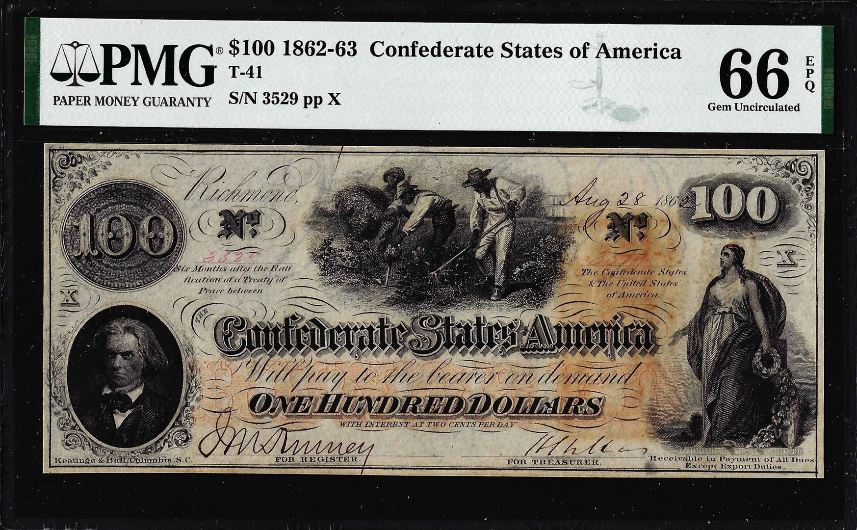 One 1862 $100 Confederate States of America Note T-41 PMG Gem Uncirculated 66EPQ. PMG Certified.