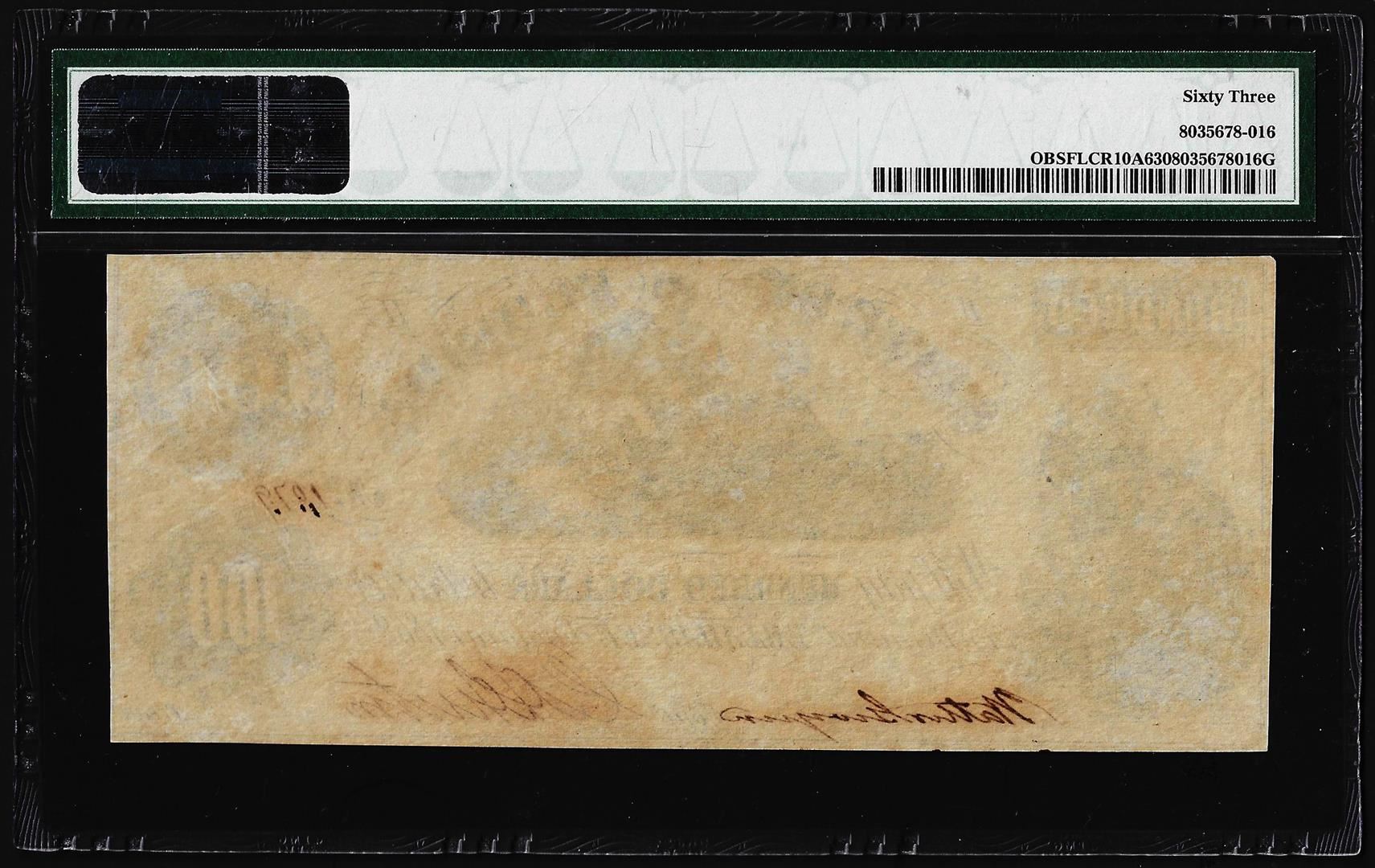 One 1862 $100 State of Florida Tallahassee Cr.10A Obsolete Note PMG Ch. Uncirculated 63. PMG Certified.