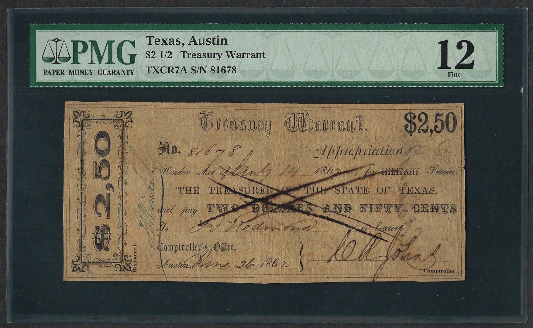 One 1862 $2 1/2 Texas Treasury Warrant Note PMG Fine 12. PMG Certified.